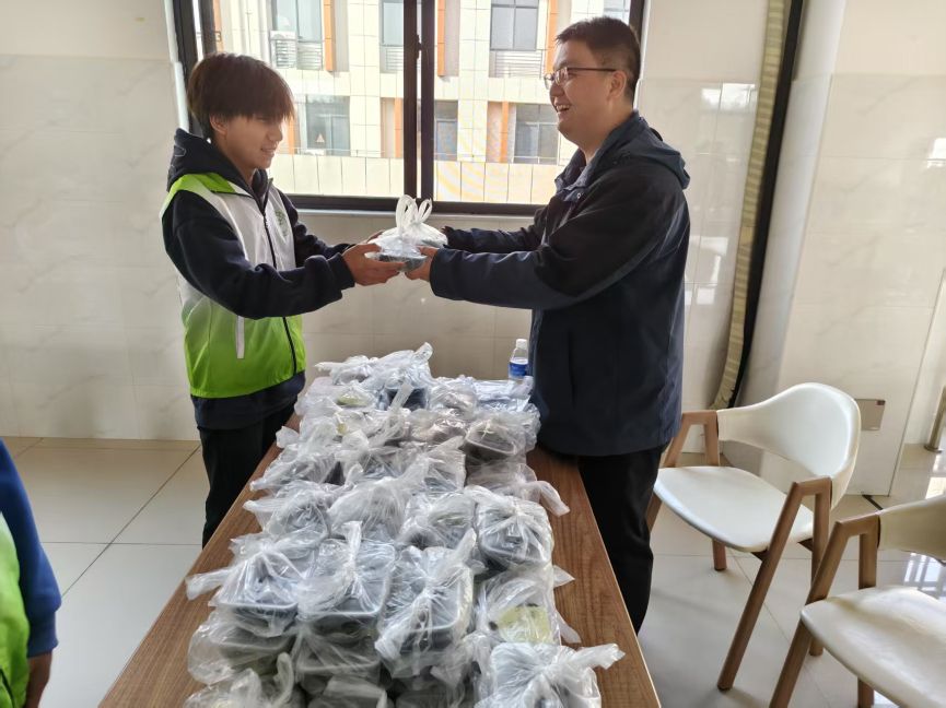活动现场特别设置“敬献春味,感恩教诲”环节,学生们将亲手制作的青团装入盒子,附上手写祝福卡。这些满载心意的青团由志愿者送至老师手中。有同学说:“以前只觉得青团好吃,今天明白了它承载的感恩文化。能把劳动成果送给敬爱的老师,特别有意义。”