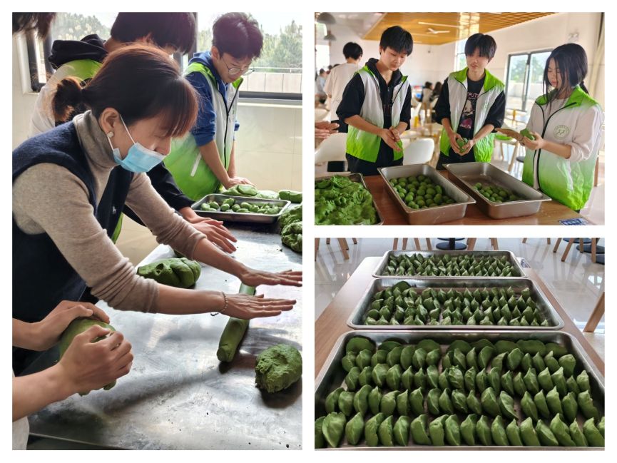 活动伊始,食堂面点师傅向同学们详细讲解了青团的由来和制作技巧。青团作为清明时节的传统点心,以艾草汁融入糯米粉制成外皮,包裹豆沙、腊肉、萝卜干等馅料,兼具清香与软糯,承载着人们对自然的敬畏与对先辈的追思。在师傅的示范下,同学们分组动手实践,从揉面、擀皮到包馅、塑形,每一步都认真细致。尽管手法略显生疏,但大家互帮互助,创意频出,现场其乐融融。