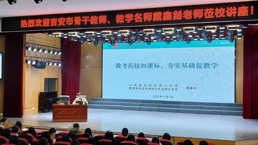 随着职业教育改革的深入推进,职教高考制度不断完善,对教学工作与备考能力提出了新的挑战与要求。为帮助我校教师进一步提升教学与备考能力,深化对教考衔接理念的理解与实践,提升我校教学质量与备考实效,2025年12月9日下午,我校特邀吉安县数学学科带头人、吉安市骨干教师、教育部“双名计划”刘志乐名师工作室核心成员戴鑫剑老师莅临我校举办专题讲座。讲座由教务科副科长邹盼主持,我校高考部全体教师及部分班级学生代表共同参加了本次重要讲座。
