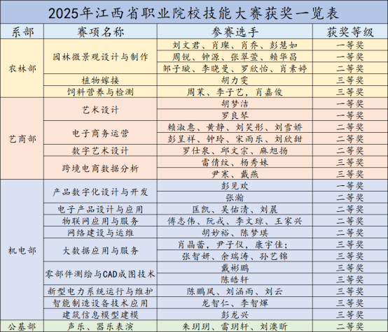 “汗水浇灌硕果,拼搏书写辉煌!”2025年江西省职业院校技能大赛成绩揭晓,我校师生凭借精湛技艺与拼搏精神,在全省赛场上表现优异。学校共派出35支参赛队伍,最终斩获25项大奖,其中包括一等奖5项、二等奖9项、三等奖11项。尤为可喜的是,共有61名参赛学生凭借突出表现,获得免试升入大专院校深造的资格,充分彰显了学校扎实的育人成效与师生过硬的专业素养。